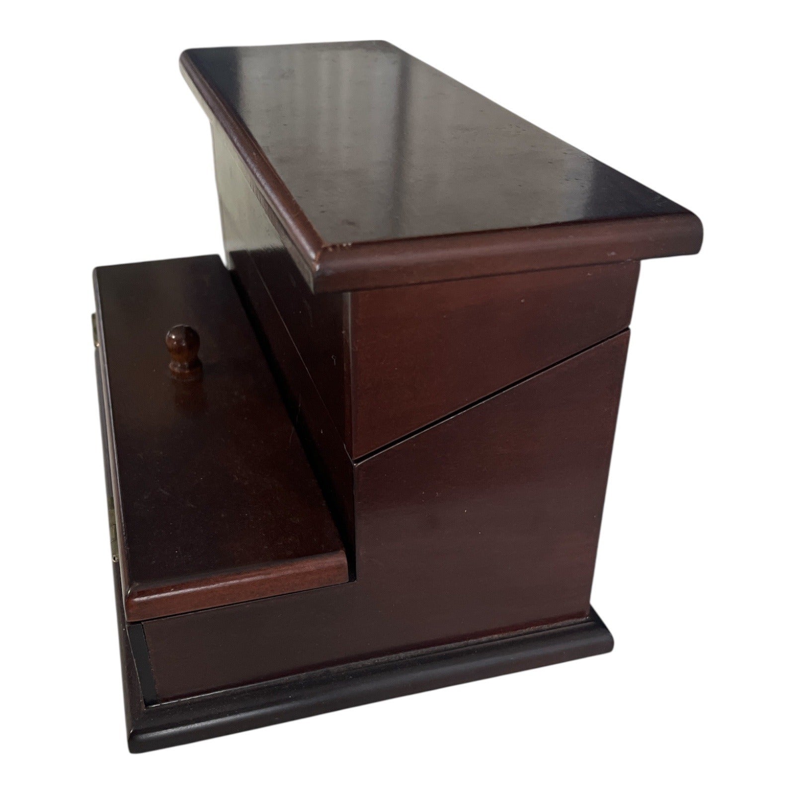 This vintage Bombay Company wooden step chest makes an elegant storage piece for a desk, vanity, or tabletop. Crafted in a rich mahogany-style finish, the box features a hinged top compartment with open storage and a stepped lower section with divided compartments. The stepped design is accented with a small wooden knob and brass-tone hinges, giving it a timeless look.