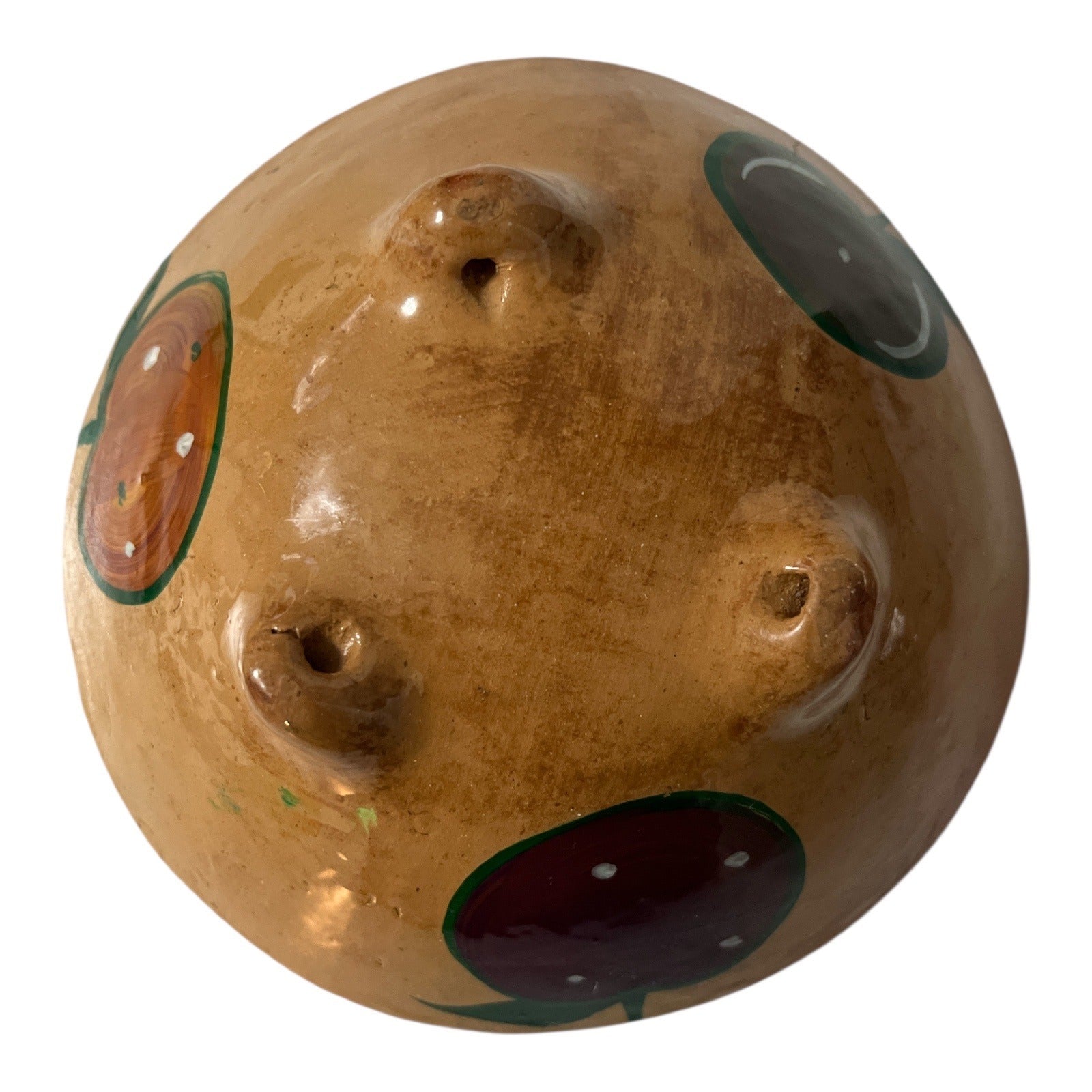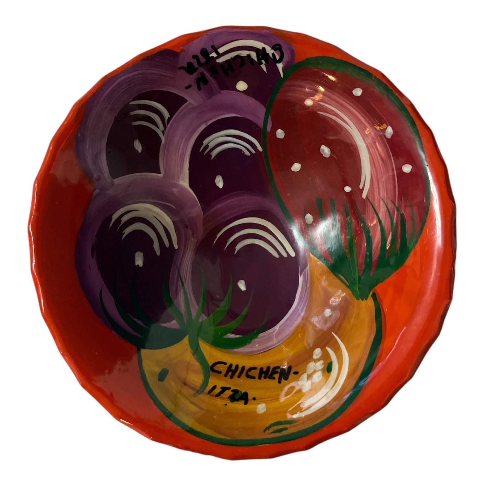 Hand-painted Mexican folk art bowl from Chichen Itza featuring vibrant fruit-inspired artwork in red, purple, green, and yellow. Signed and crafted in traditional pottery style.