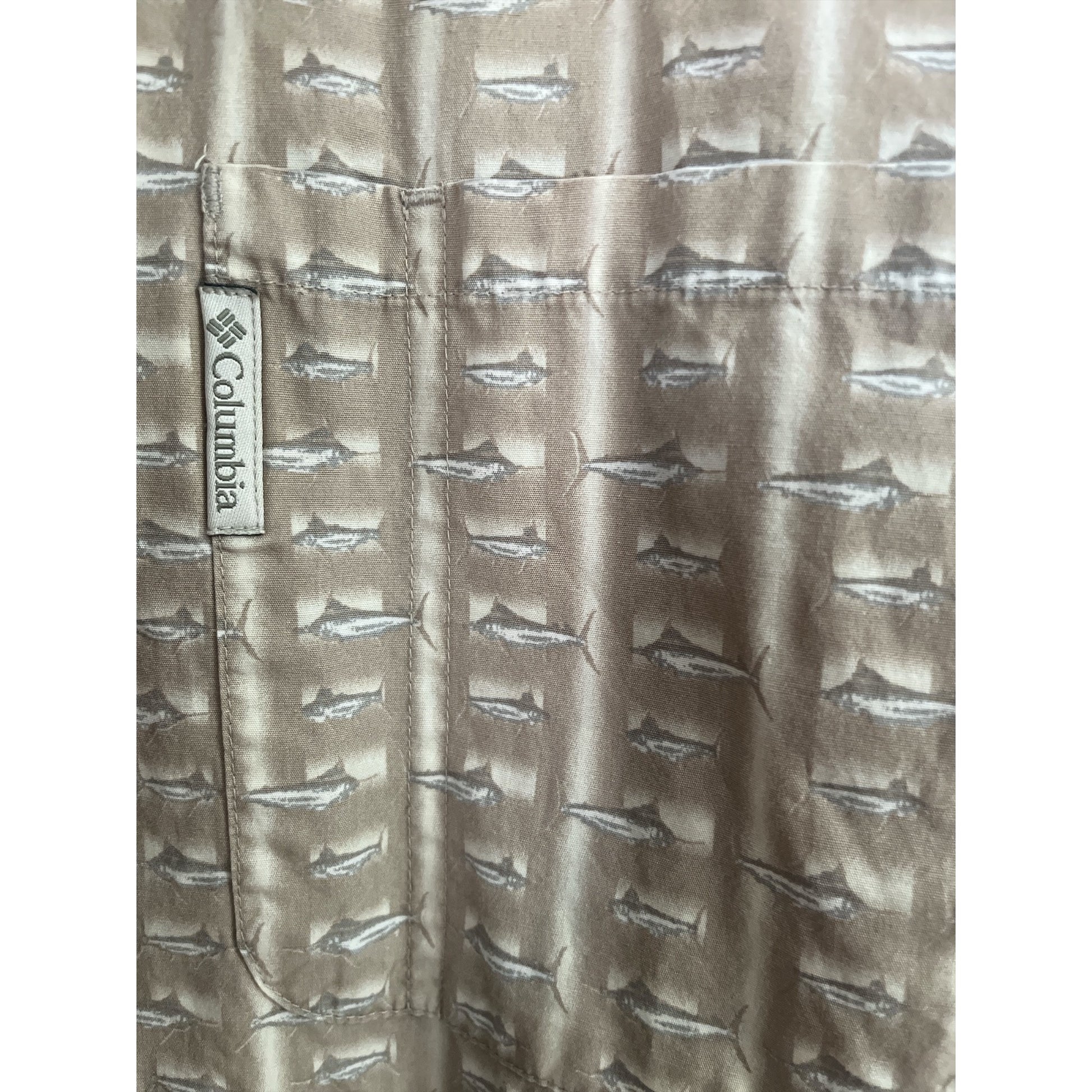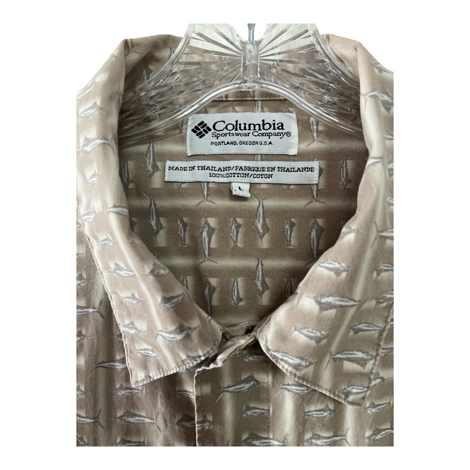 This vintage Columbia Sportswear Company men’s button-down shirt features a subtle allover fish print in neutral taupe and beige tones. Crafted from 100% cotton, it offers a lightweight, breathable fit with a soft drape. Perfect for anglers, outdoor enthusiasts, or anyone who loves classic Columbia style.
