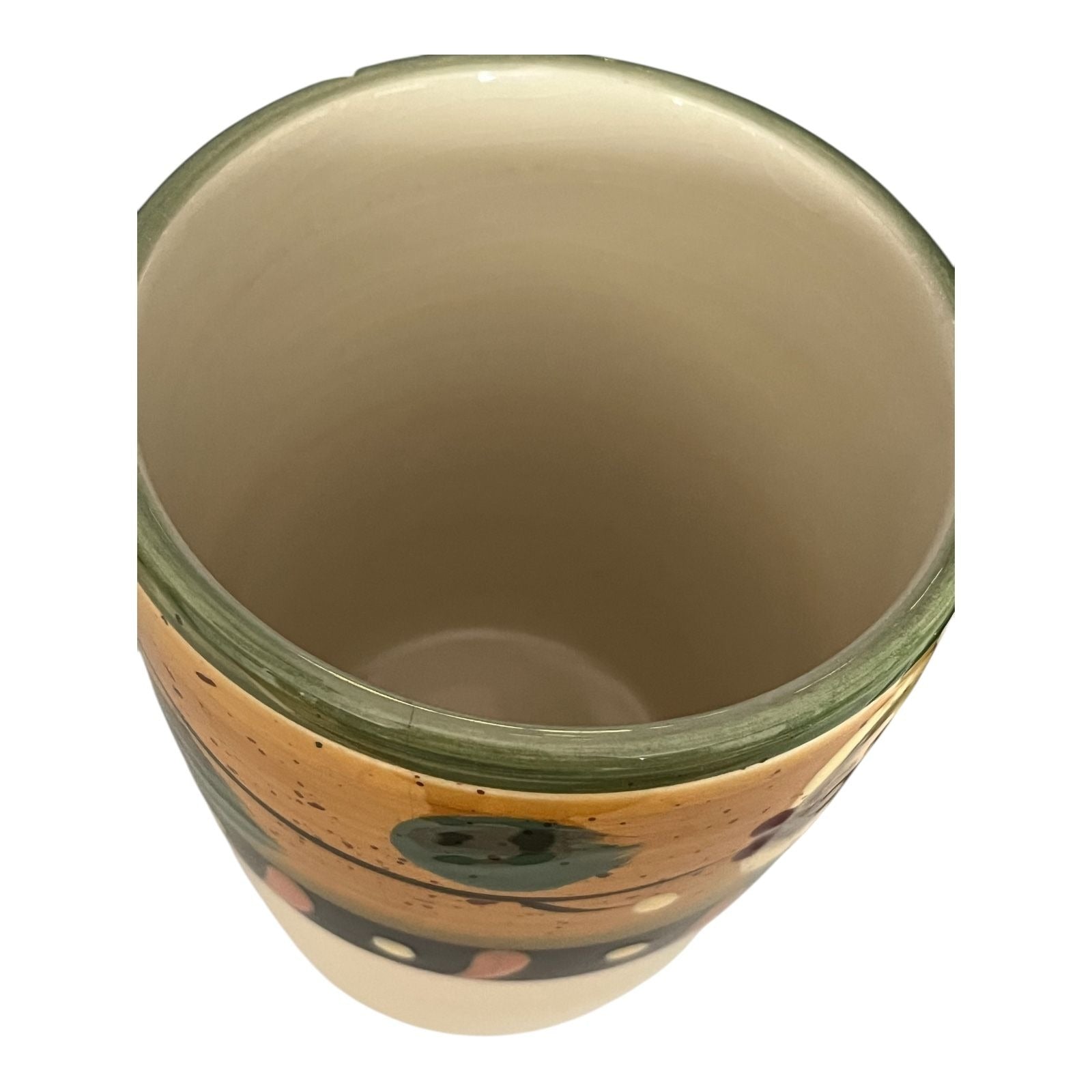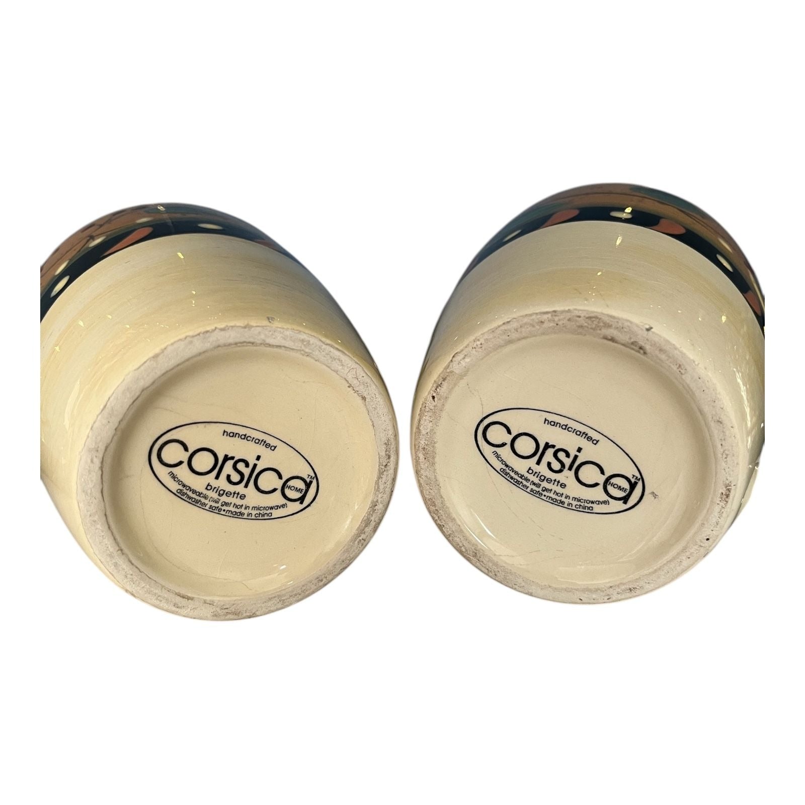 Add rustic charm to your kitchen with this set of two **Corsica Brigette handcrafted stoneware mugs**. Each mug features a hand-painted vine and floral design in warm yellow, green, and black tones, finished with a bold green handle. Perfect for coffee, tea, or hot cocoa, these mugs are sturdy yet decorative.