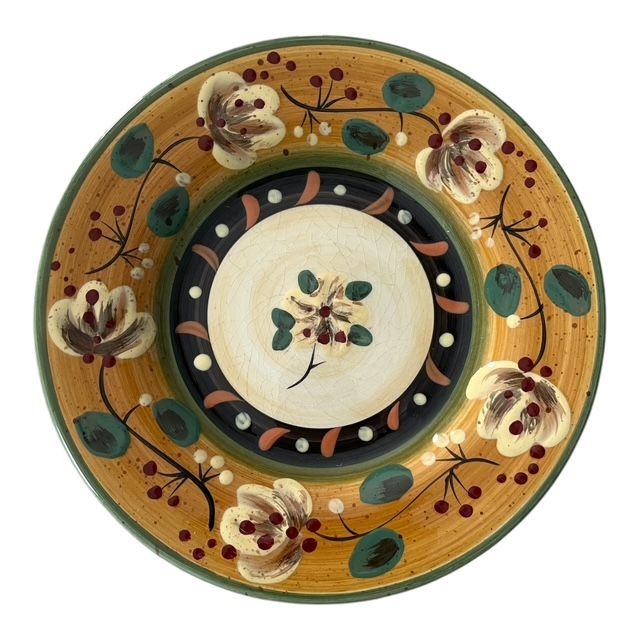 Set of two Corsica Home Brigette handcrafted rimmed soup/pasta bowls featuring a warm floral design in golden and teal tones. The wide rims and shallow centers make them versatile for soup, salad, pasta, or decorative use. Both bowls show age-related glaze crazing.