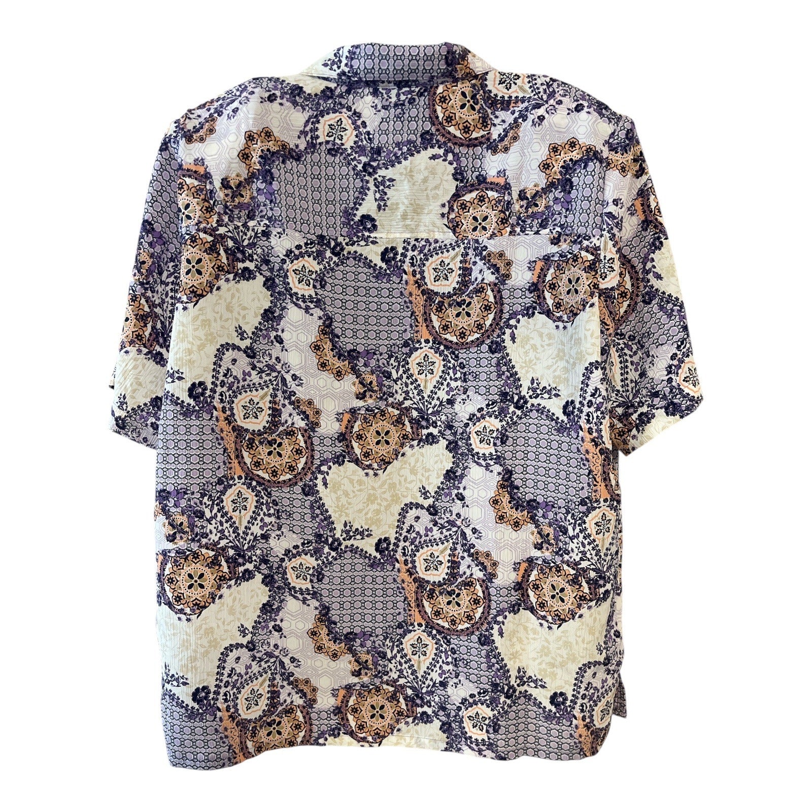 Add a touch of retro flair to your wardrobe with this vintage **Donnkenny Classics blouse**. Designed in the late 1990s to early 2000s, it features a bold geometric and floral patchwork-inspired print in shades of purple, cream, peach, and navy. The lightweight 100 percent polyester fabric makes it comfortable and easy to wear, while the built-in shoulder pads give it that signature structured vintage look. Perfect for both office and casual wear, this blouse is versatile and stylish.