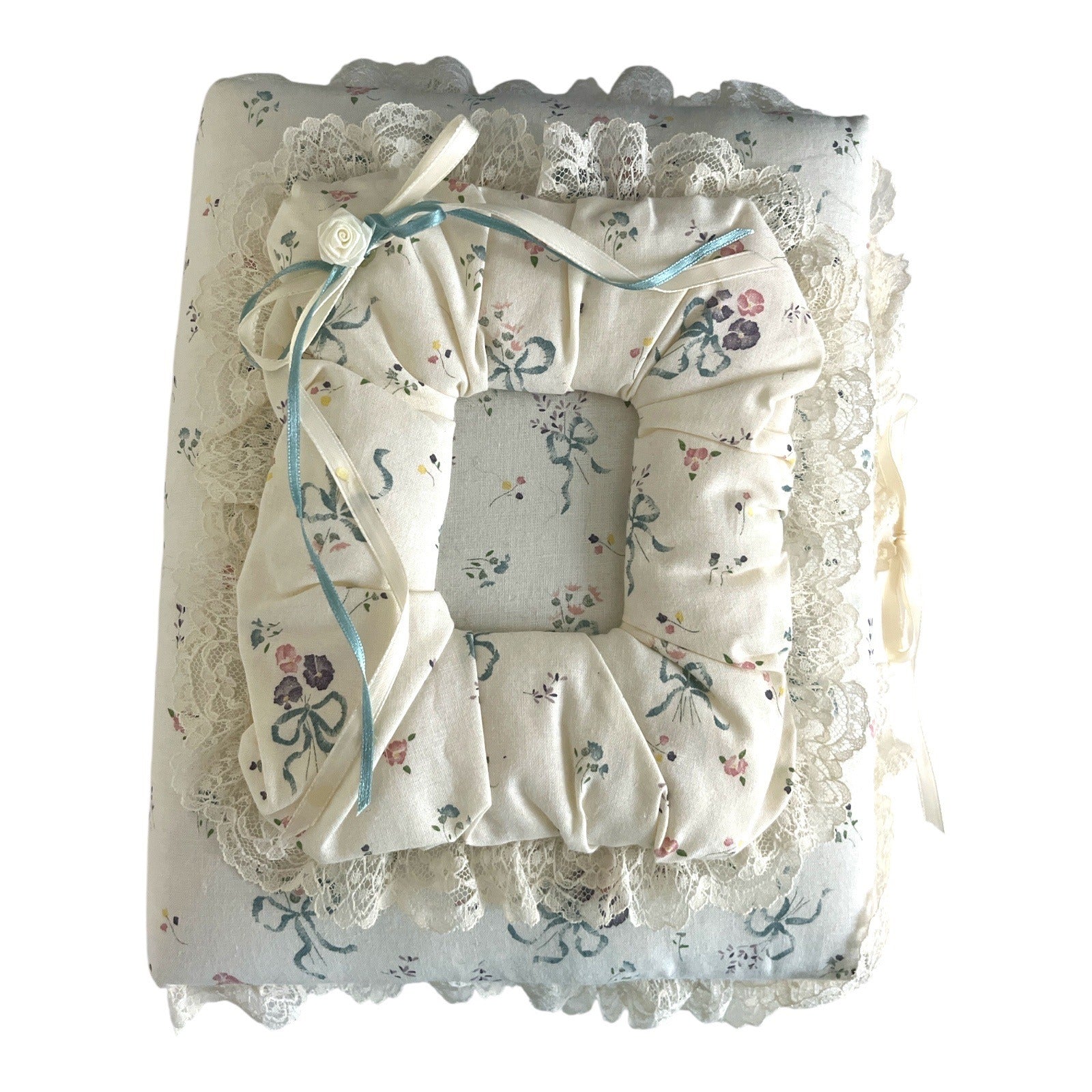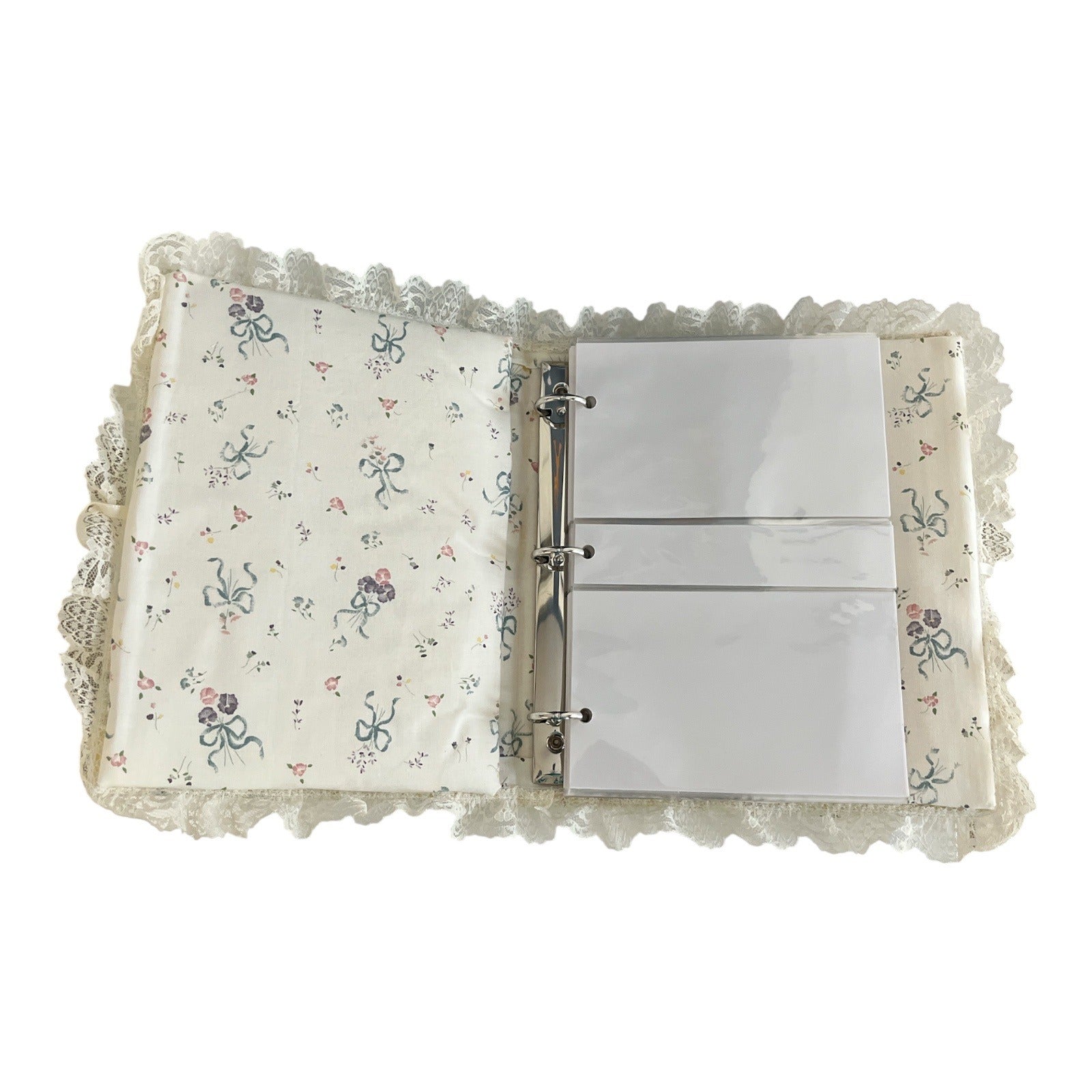 Charming vtg padded photo album with a floral fabric cover and lace trim. The front features a puffy fabric frame with ribbon and rosette accents. Inside are 46 plastic pages sized to hold standard 4x6 photographs. A beautiful way to store memories, weddings, or special keepsakes in a romantic cottage style.