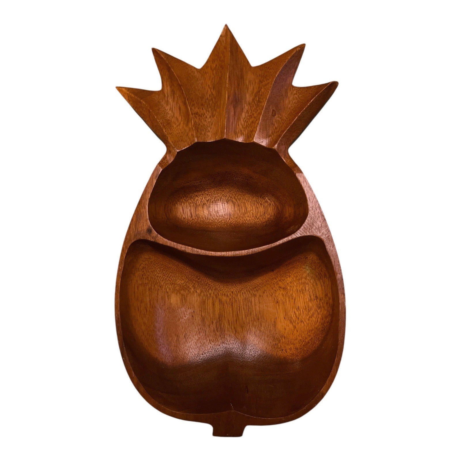 Beautiful mid-century style carved pineapple dish made from solid wood. Features two smooth compartments perfect for nuts, candies, dips, olives, or decorative display. Warm honey-brown tone with visible natural grain. Classic tropical décor accent.