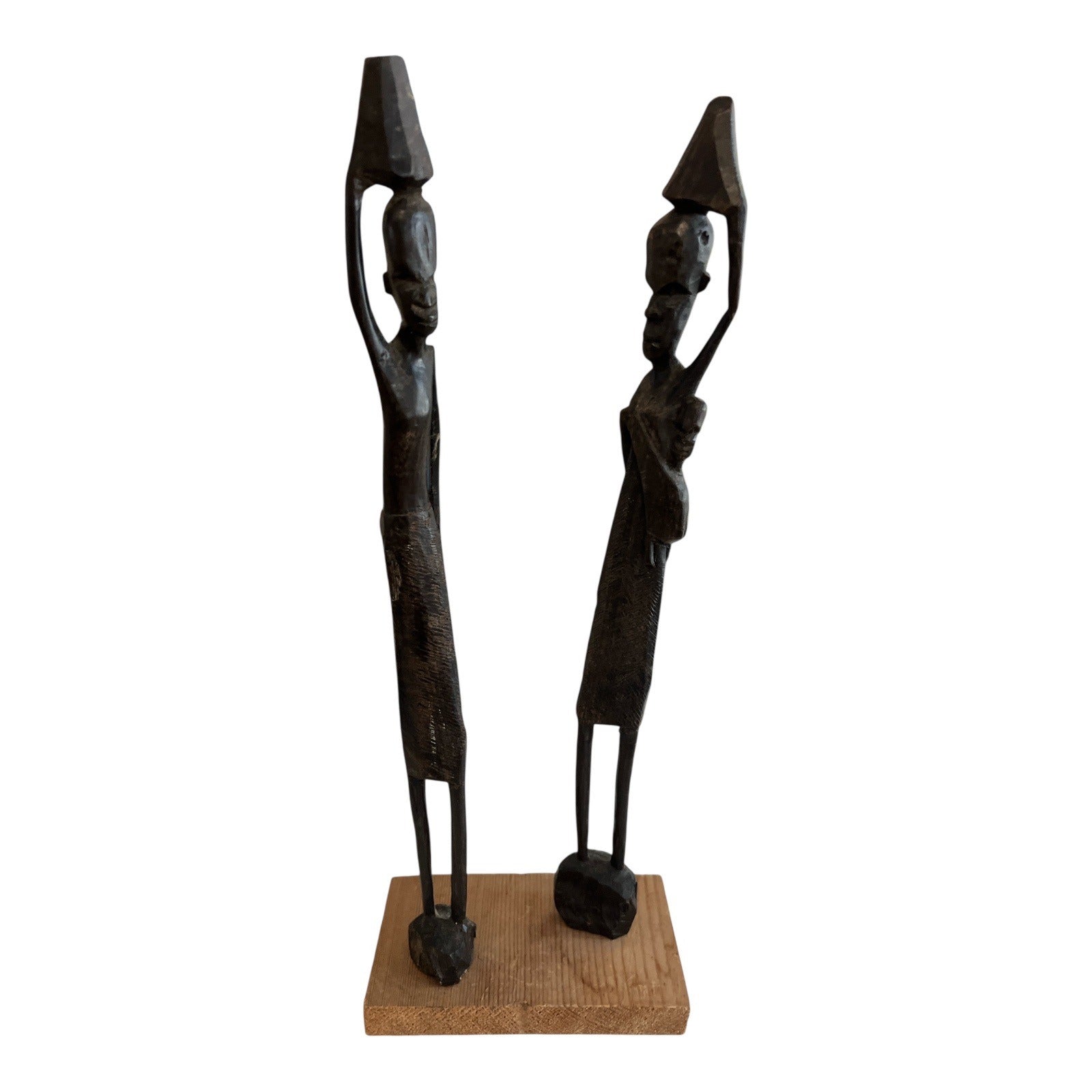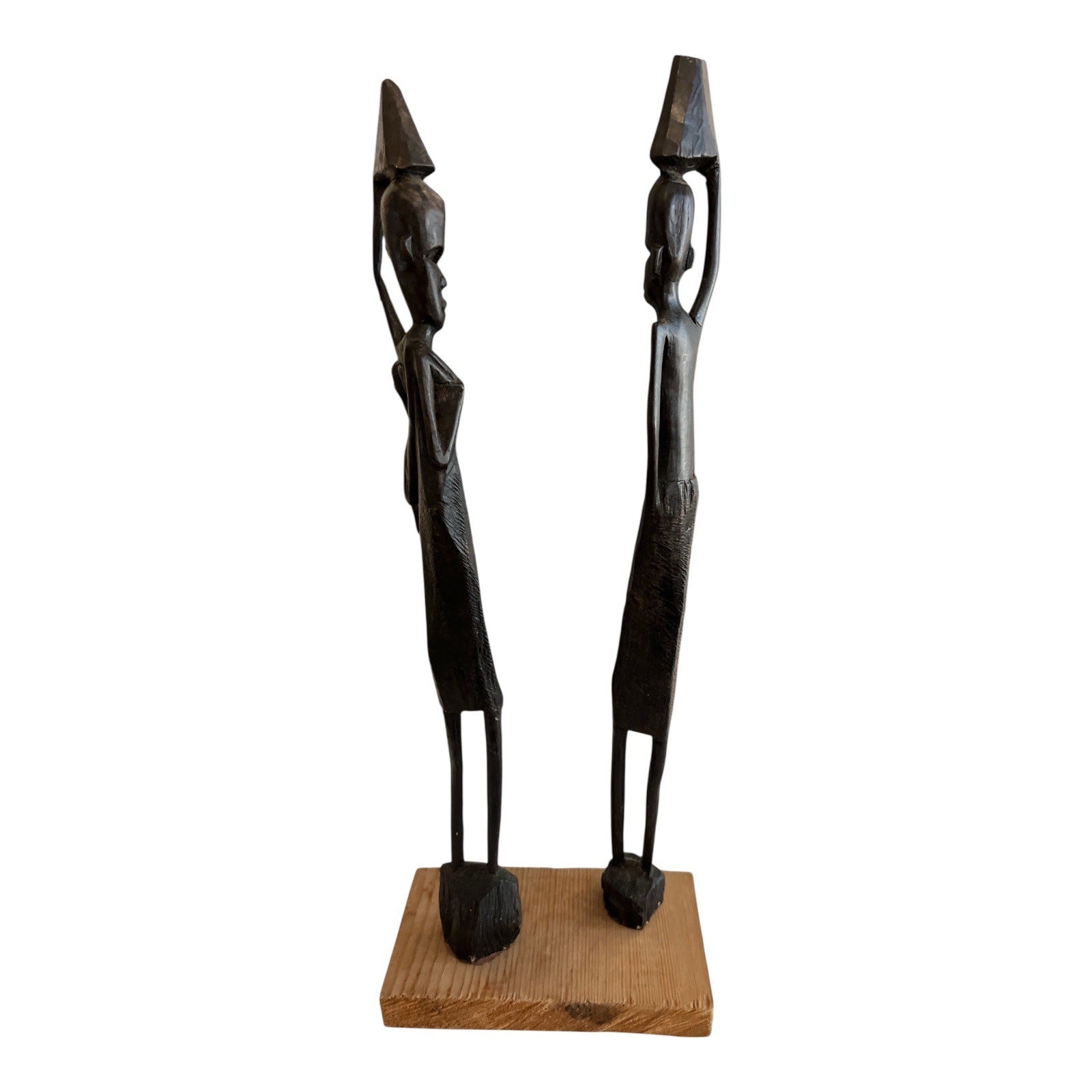 This vintage hand-carved wooden sculpture depicts two elongated tribal figures carrying vessels on their heads, mounted on a rectangular wooden base. Crafted with detailed carving and a dark stained finish, the piece reflects traditional African folk art styling. Its tall, slim design makes it a striking decorative accent for a shelf, mantel, or art collection.