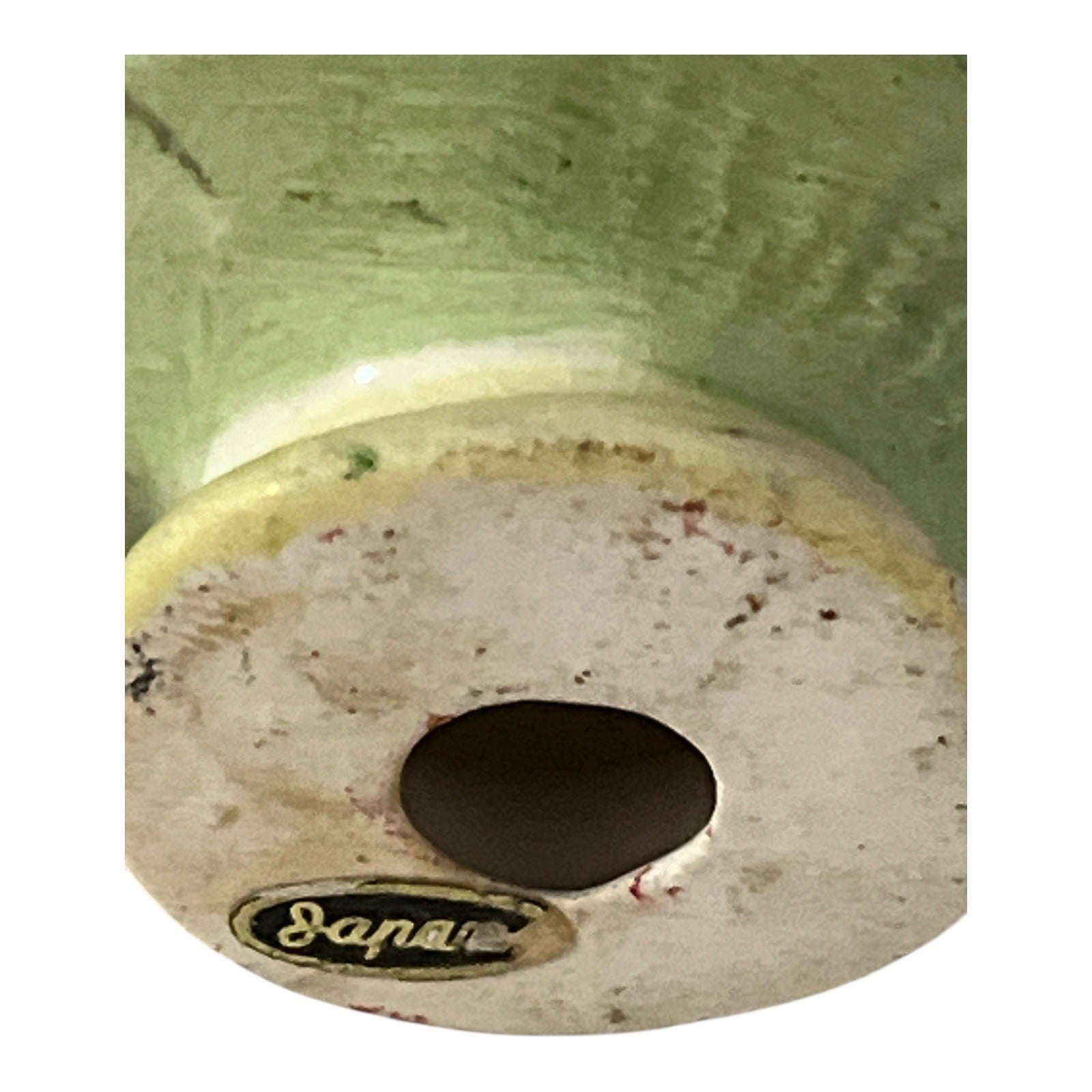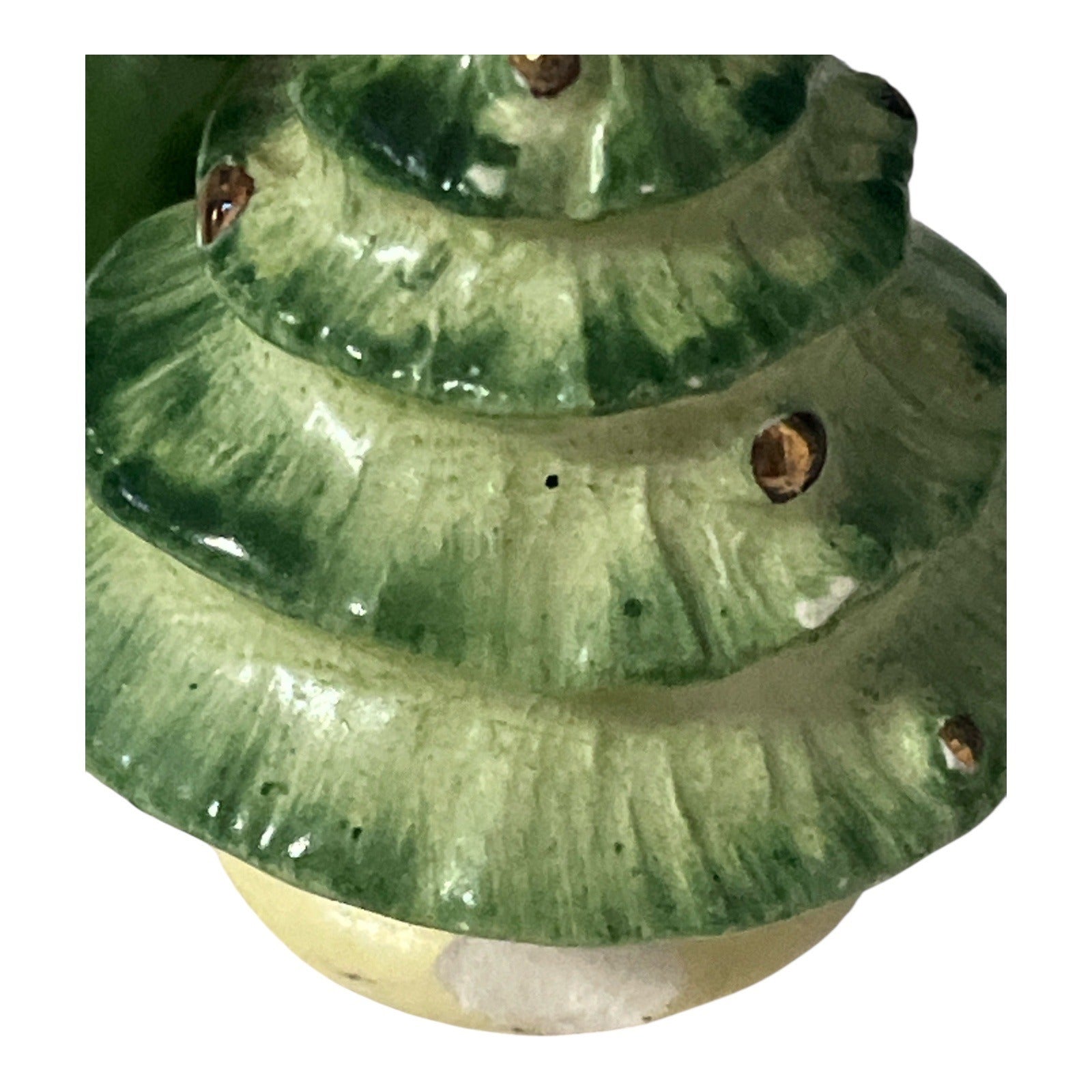 Charming mid-century ceramic Christmas elf made in Japan, featuring a kneeling elf placing a star on a retro green Christmas tree. Classic 1950s–60s Japan styling with expressive painted features, glossy glaze, and gold-tone accents. A sweet collectible for vintage holiday displays.