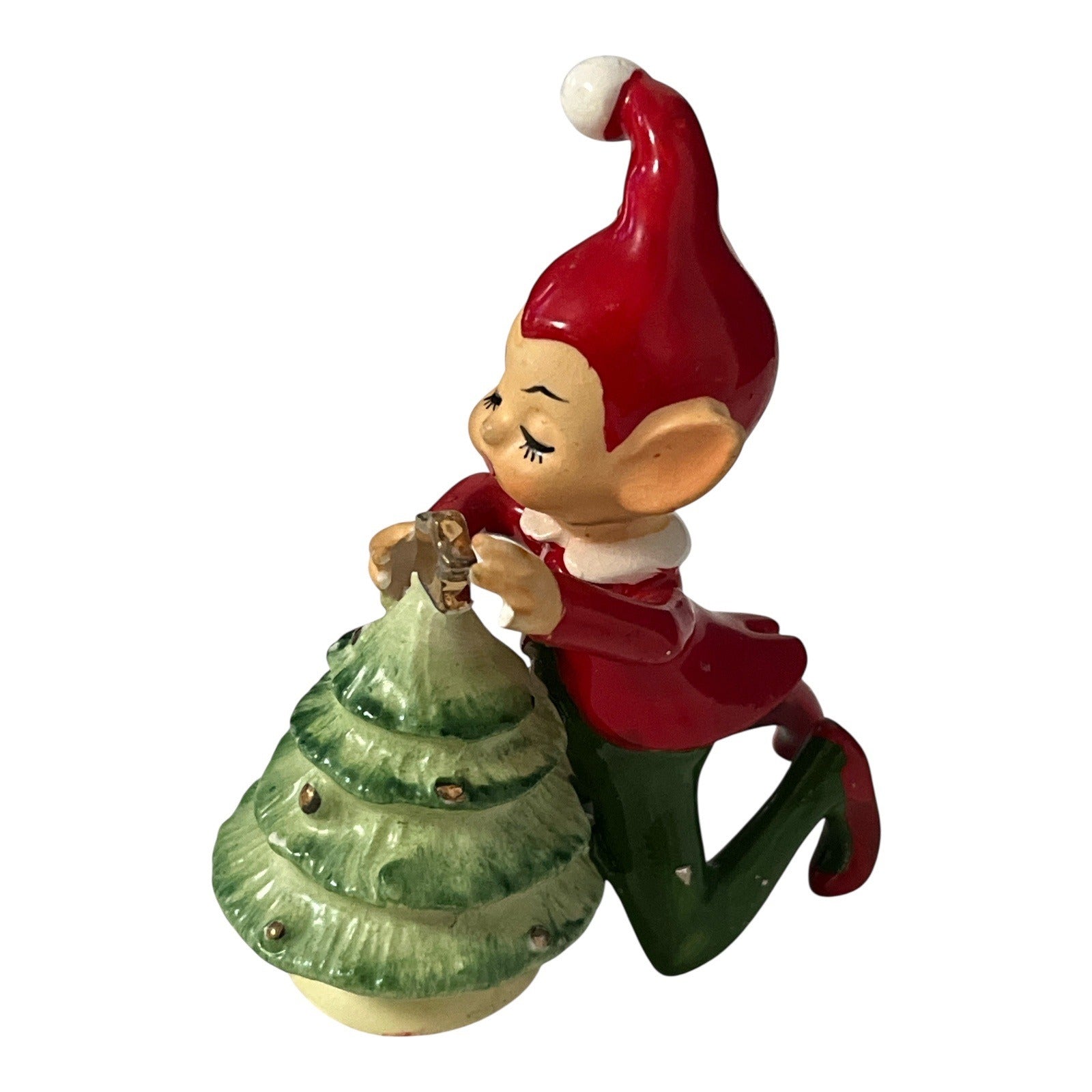 VTG Japan Ceramic Christmas Elf Kneeling by Tree – Mid-Century Holiday Figurine