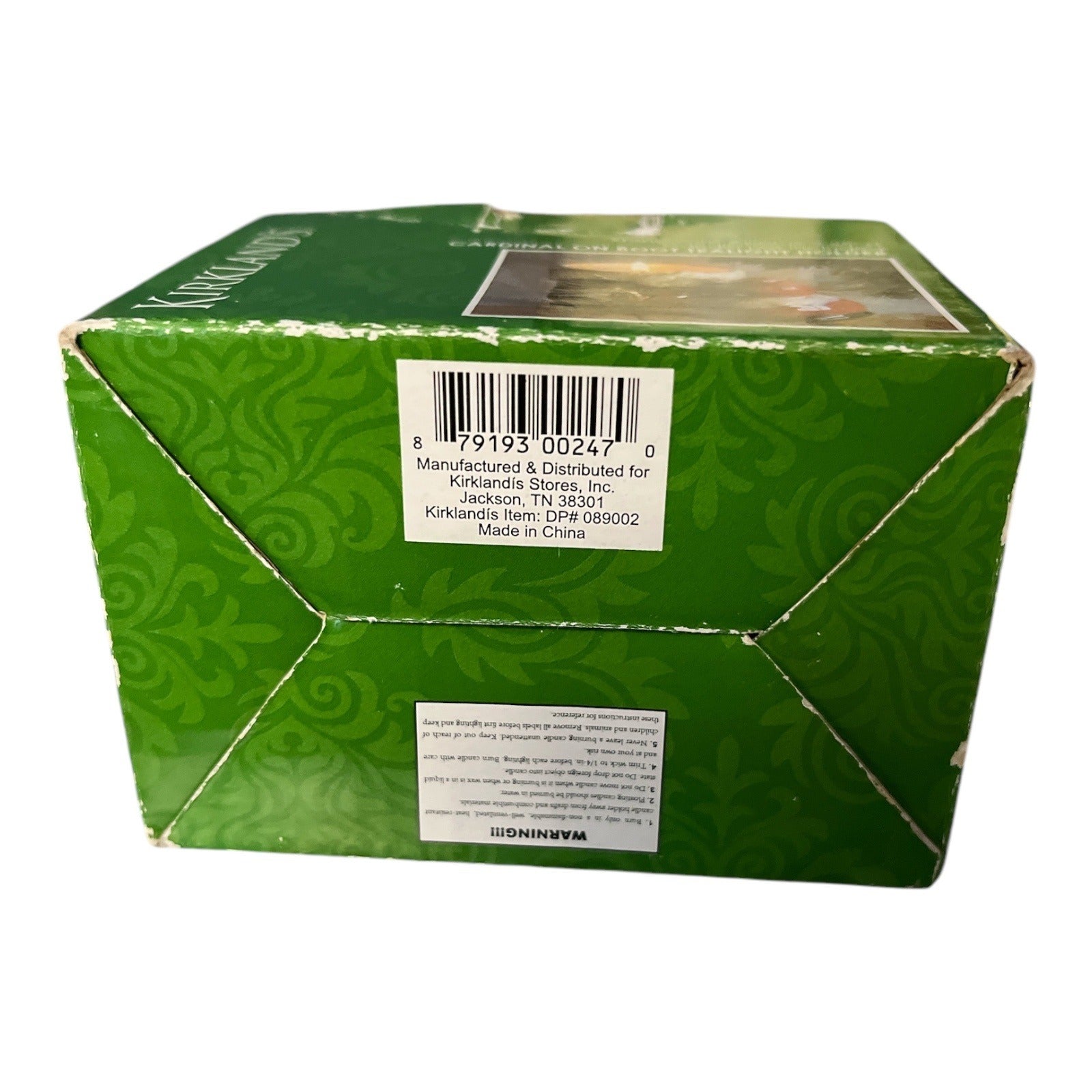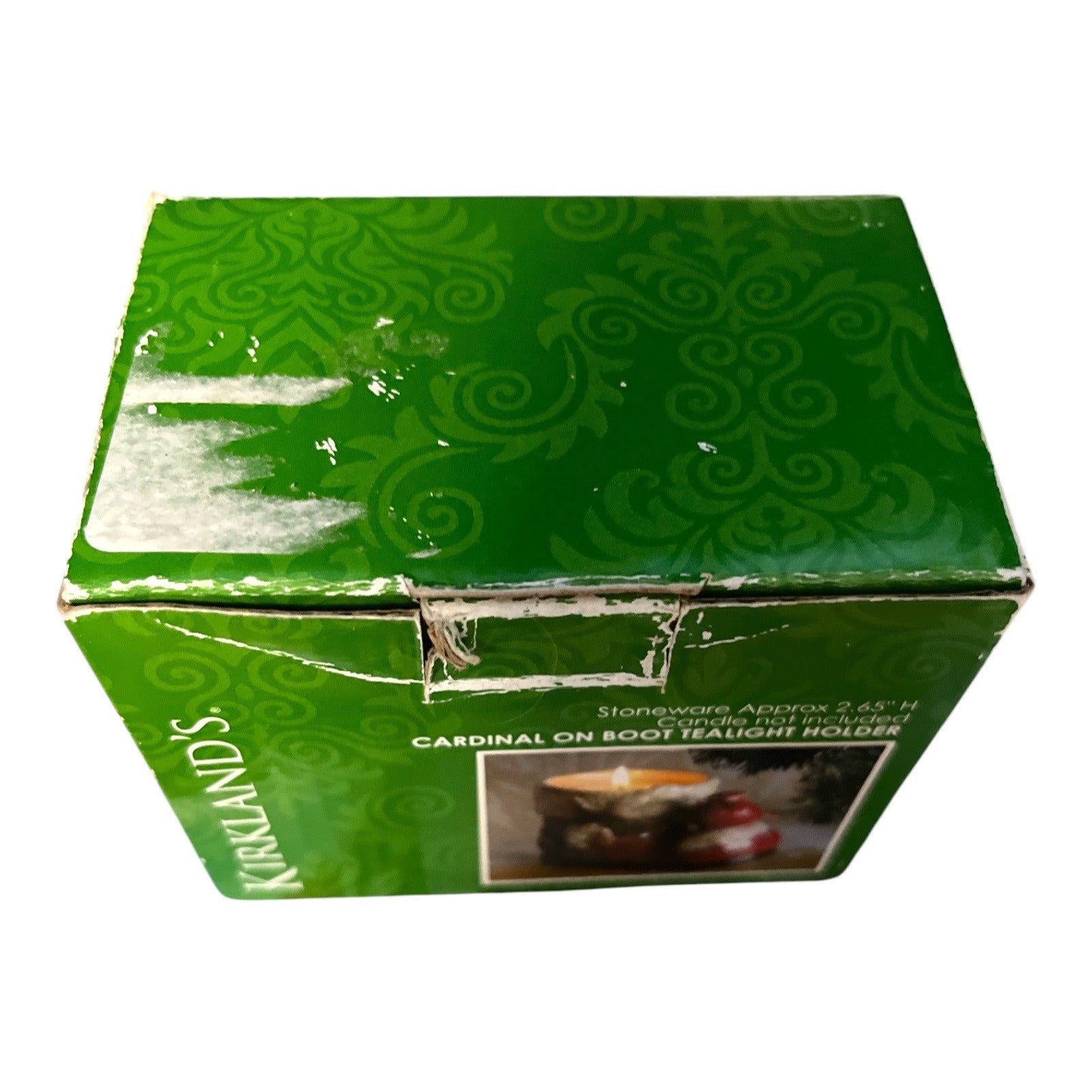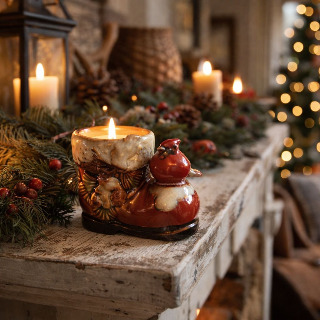 Charming Kirkland stoneware tealight holder featuring a red cardinal perched on a rustic winter boot with pinecones and greenery detail. Designed to hold a standard tealight candle (not included). Rich red, cream, and brown glaze with textured detailing. A cozy holiday accent perfect for mantels, shelves, or tabletop displays.