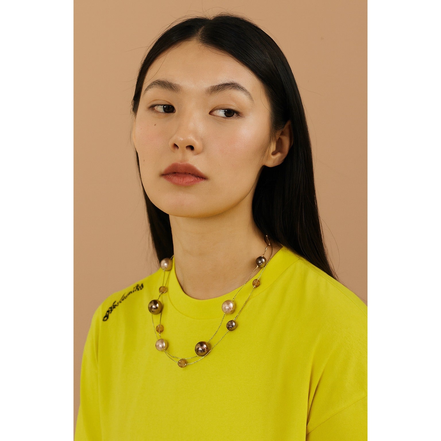This vintage RMN necklace features a double-strand design with alternating oversized pearl-style beads in champagne and bronze tones, accented by pink faceted beads. The strands sit gracefully on a gold-tone chain with an adjustable extender for the perfect fit. A versatile accessory that pairs well with both casual and dressy looks.