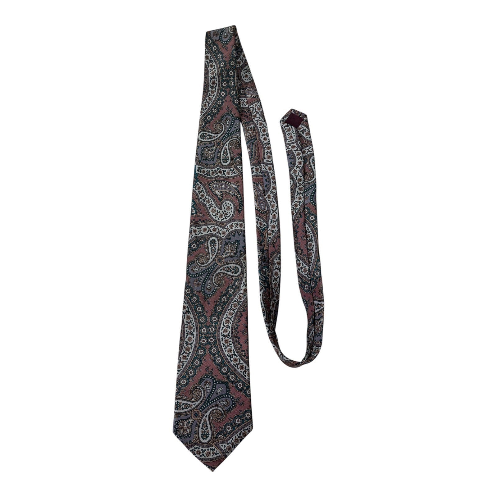 This vintage men’s tie was made by State Street exclusively for Jordan Marsh, the historic U.S. department store chain (operated 1861–1996). Featuring a bold paisley pattern in shades of burgundy, teal, cream, and gold, it reflects the rich, patterned styles popular in the late 1970s through 1980s.
