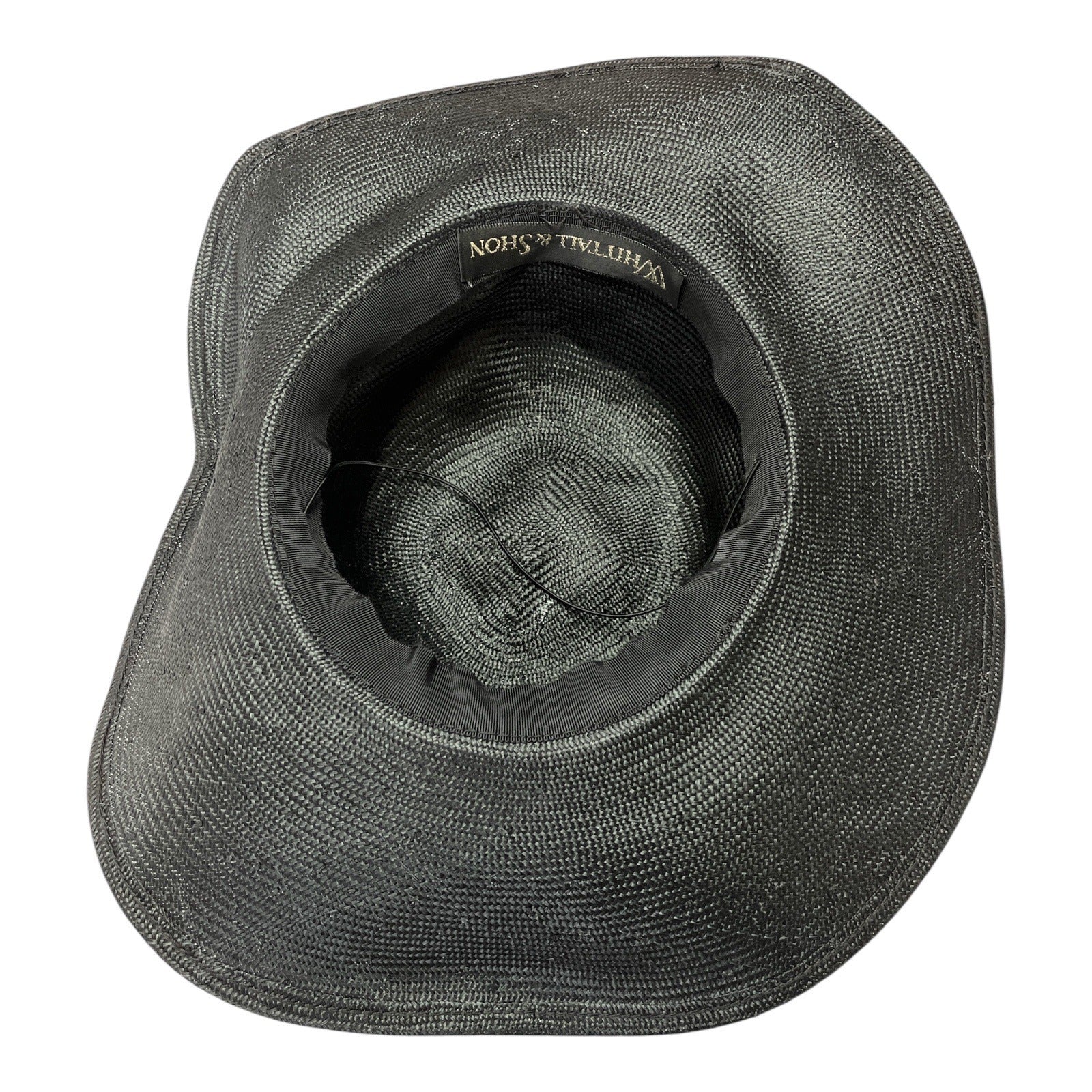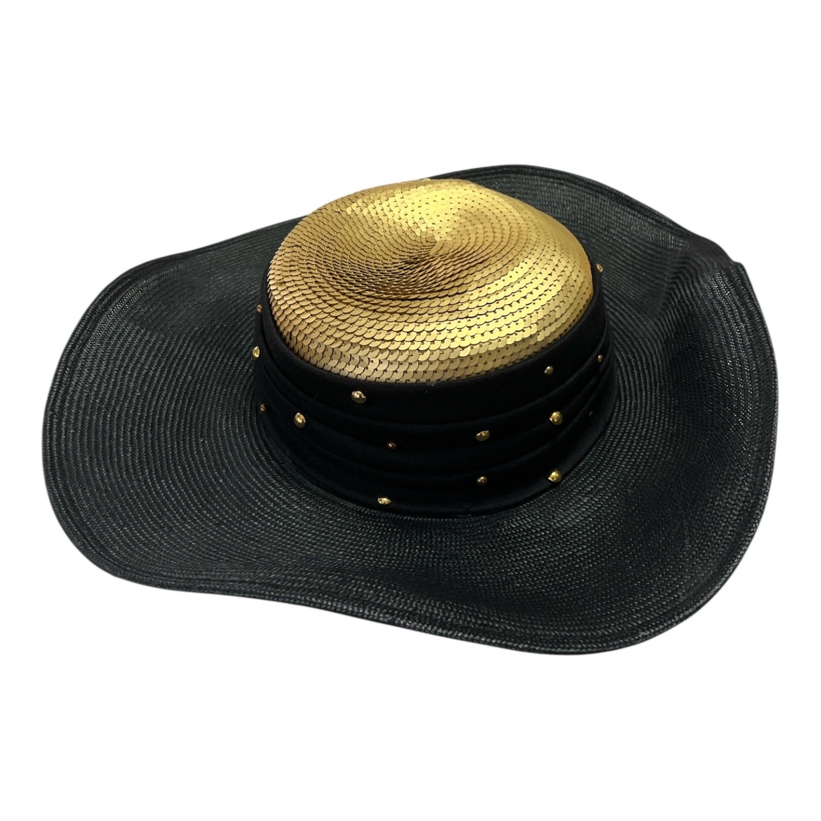 Vtg Whittall & Shon Black Wide-Brim Hat with Gold Sequin Crown & Studded Band