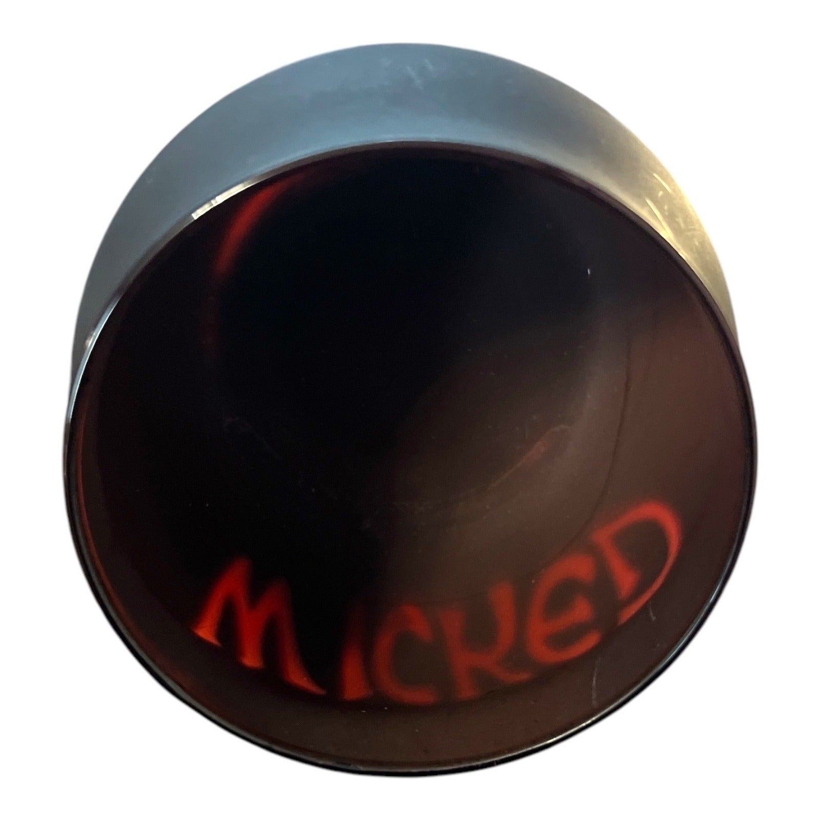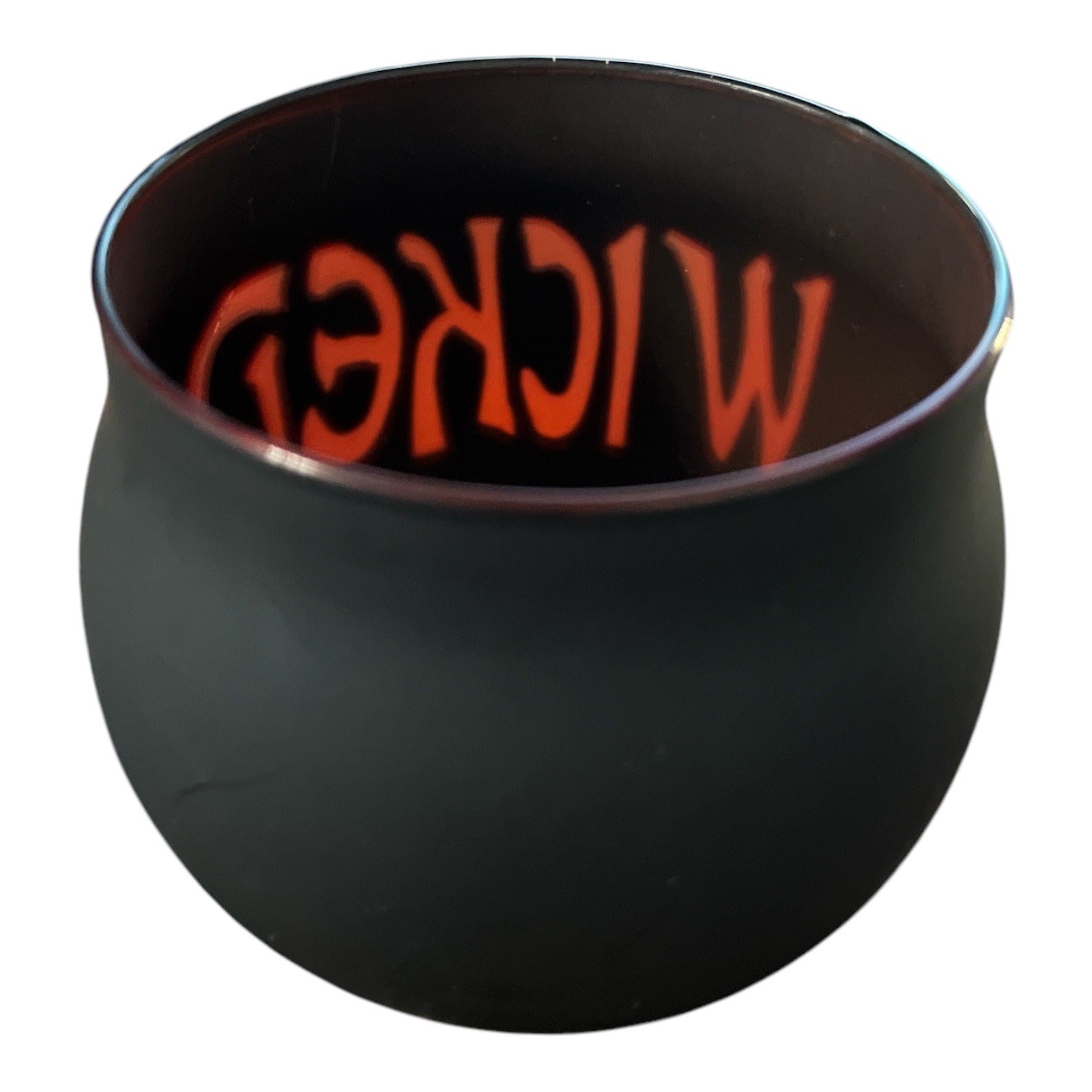 Black glass candle holder made exclusively for Yankee Candle, featuring the word “Wicked” cut through the exterior to reveal a deep red interior glow when lit. Designed for Halloween or gothic-style decor, this compact holder creates a dramatic effect with votive or tealight candles. Marked on the base as a Yankee Candle exclusive.